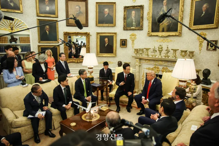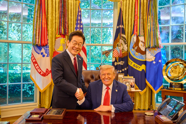 회담장에 들어선 이재명 대통령의 첫 마디가 압권이었다. "품격이 있다"면서 오벌 오피스 인테리어 리뉴얼을 칭찬한 것이다. 트럼프가 가장 자랑스러워하는 황금빛 장식들을 정확히 짚어낸 순간, 그의 표정이 확연히 밝아졌다.