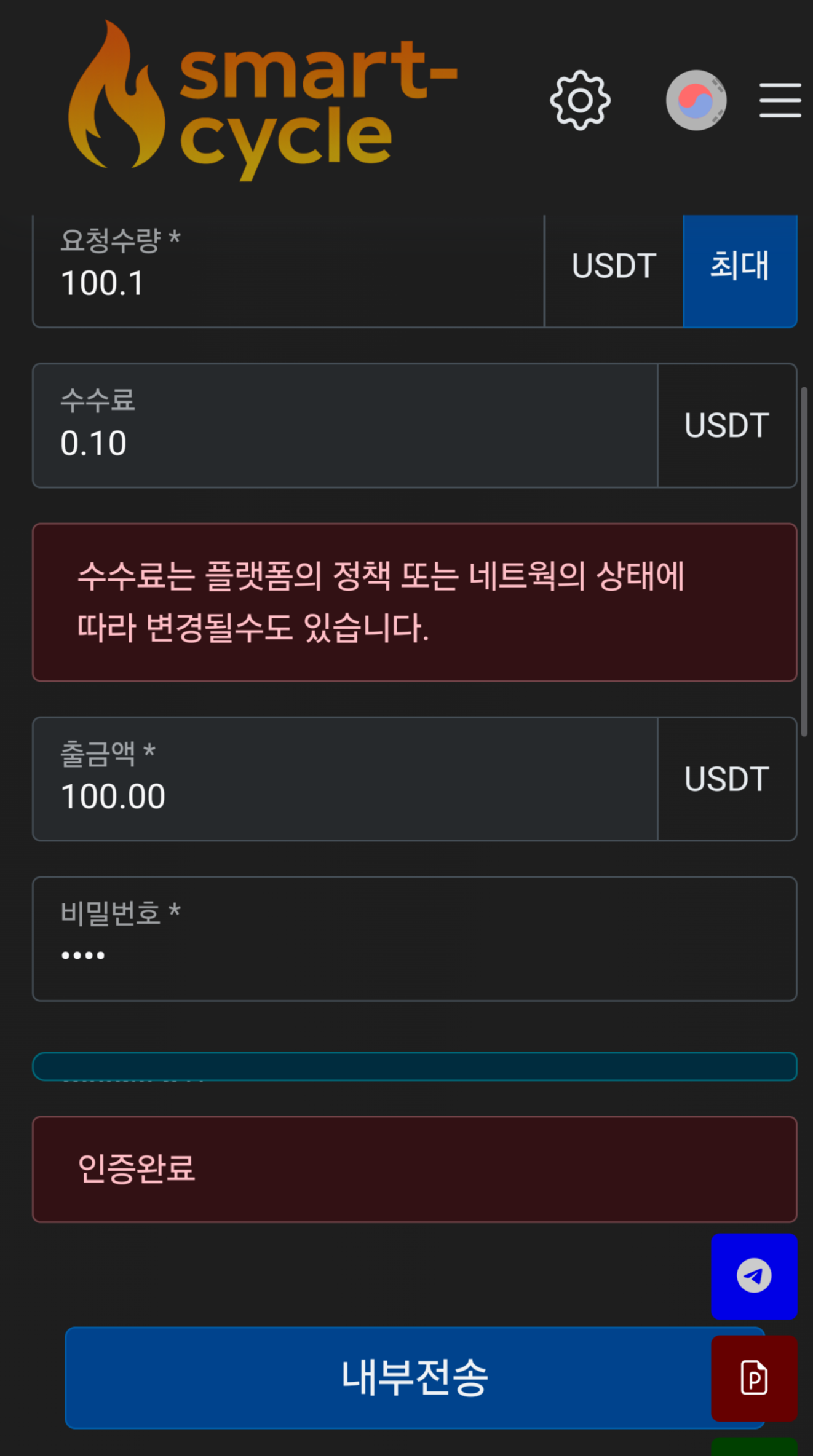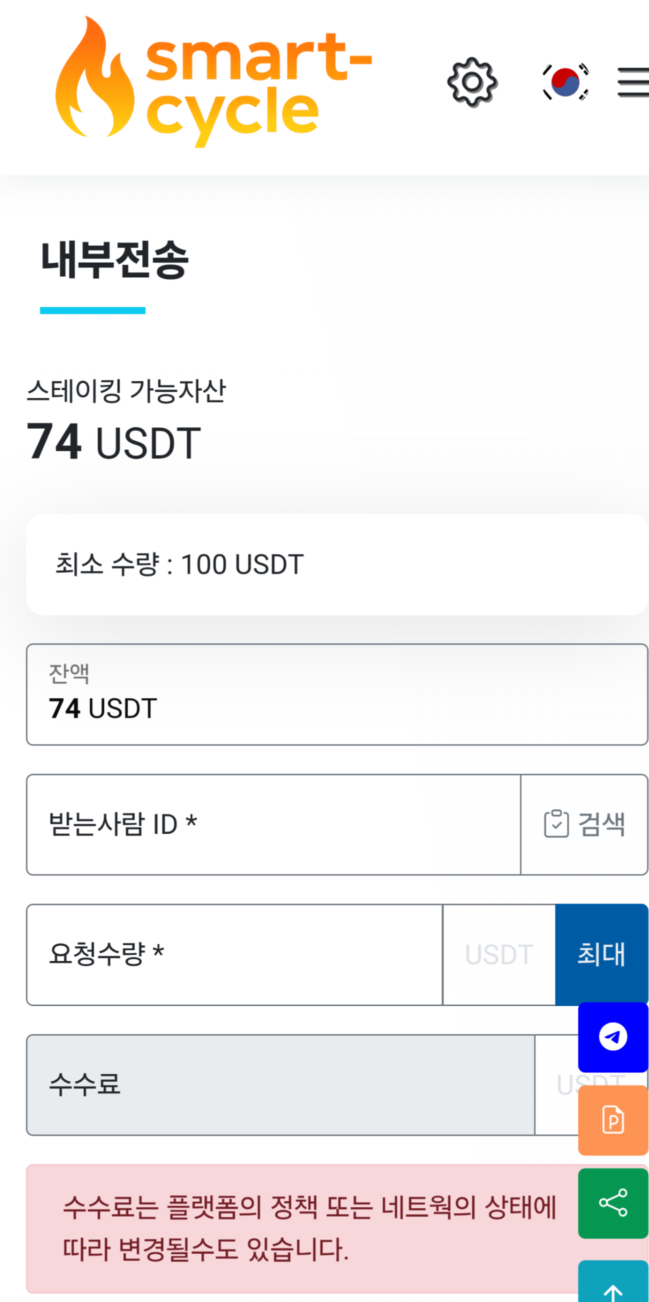 - 요청수량 (최소수량: 100 USDT)