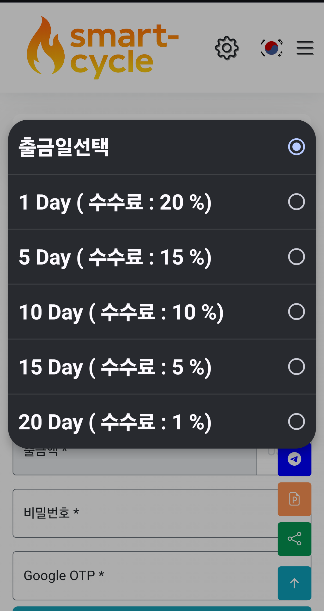3. 여기서 출금일 선택은 중요한 요소다. 1 Day를 선택하면, 신청한 날로부터 24시간이 지나서 찾을 수 있다.