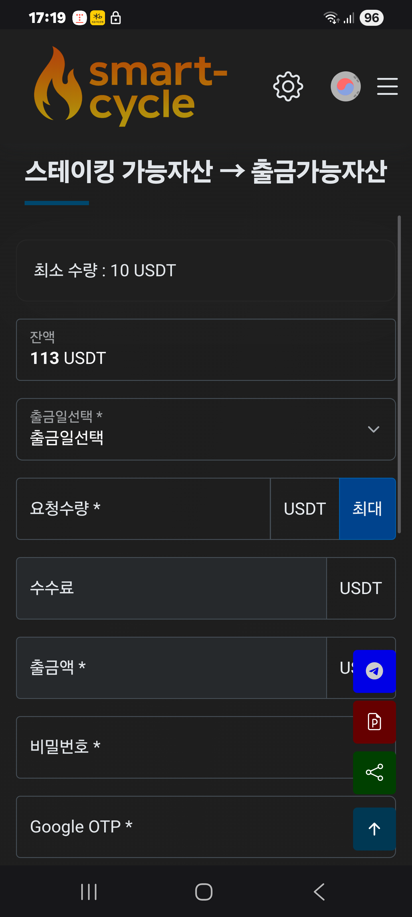 - 출금 금액 입력 (최소 10 USDT 이상)