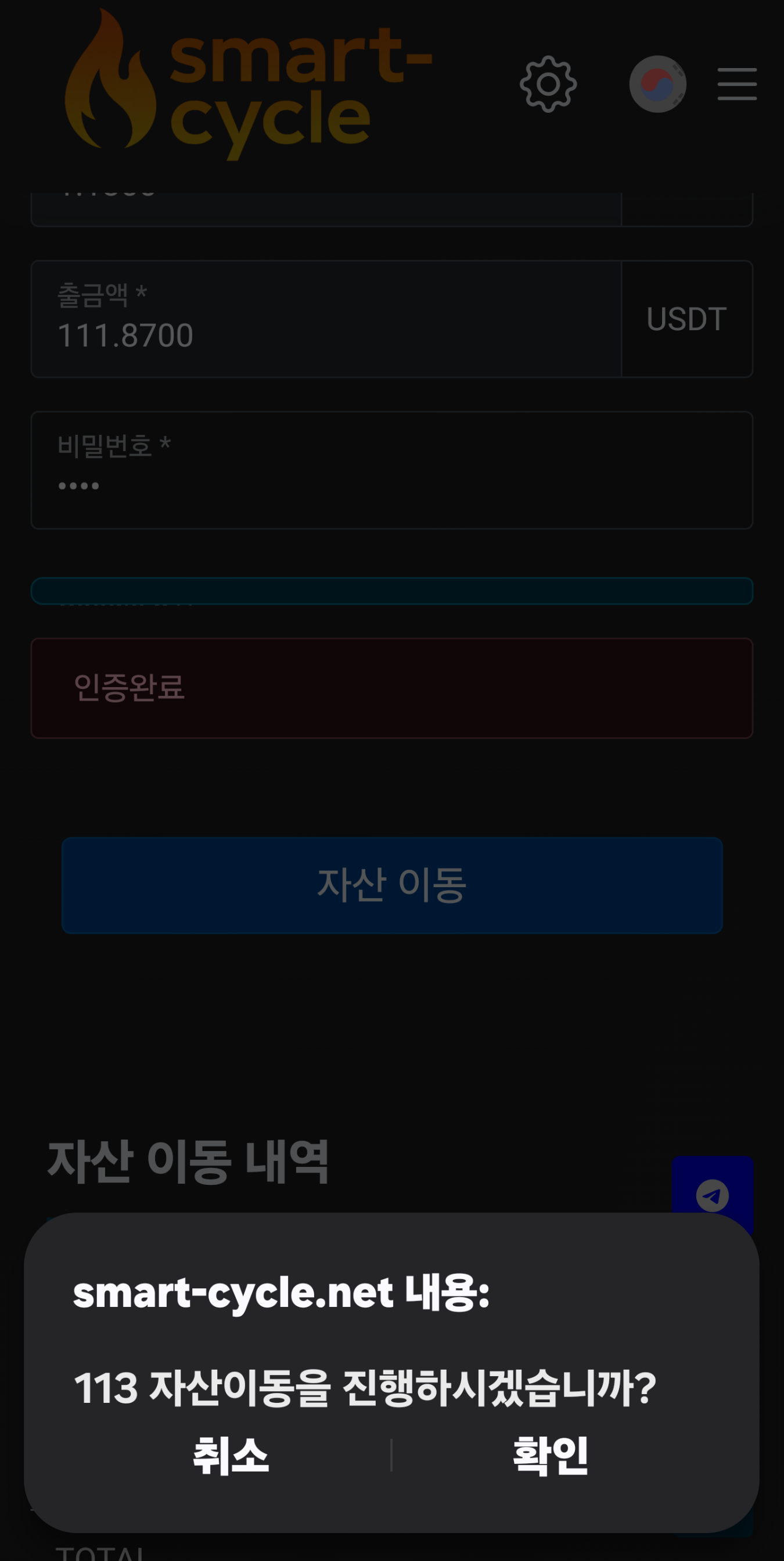 5. 자산이동을 클릭하면 다시 한번 묻는다. 자산이동을 정말 하겠는가? 하고 확인을 클릭한다.