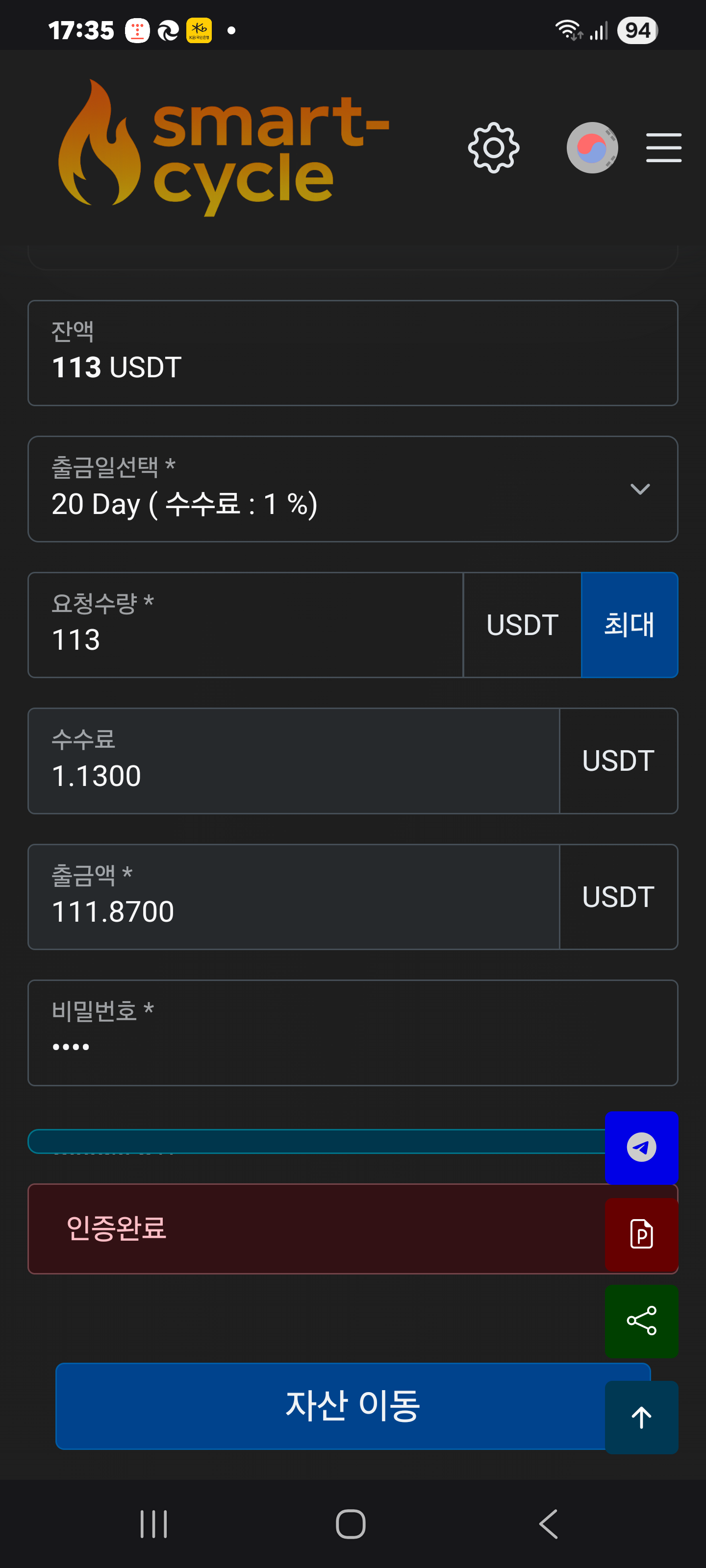 4.20 Day를 선택한 화면이다. 수수료가 1% 빠지고 비번과 구글 OTP 인증을 마치고 자산이동을 클릭한다.(22일~23일 정도 소요)