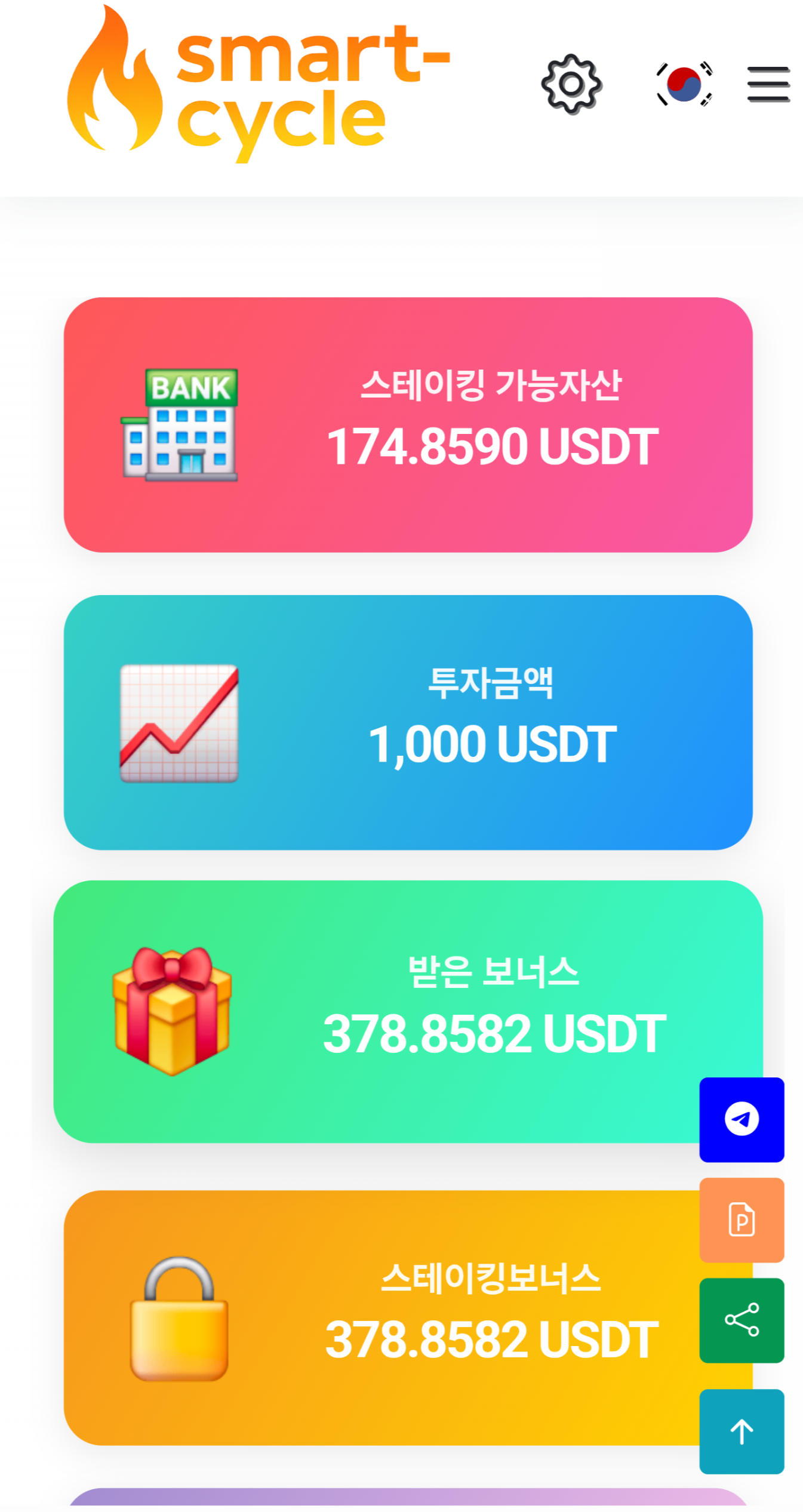 2. 스테이킹 가능자산→출금가능자산이라고 되어있다. 출금을 하기 위해서는 보너스출금을 해야 메인화면에 출금가능자산 표시가 명기된다. 여기서는 출금일을 선택하도록 되어 있다.