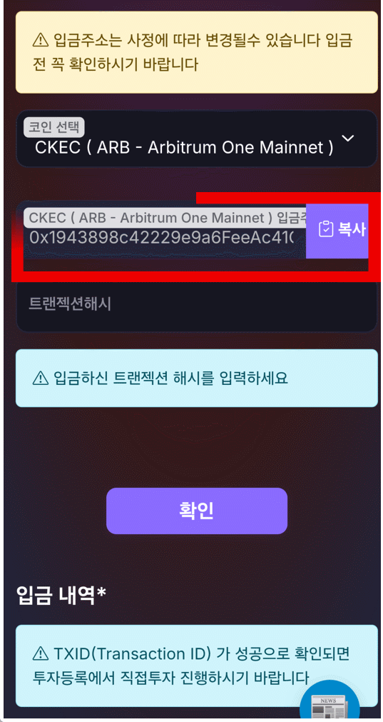 반드시 MEXC 거래소에서 전송시 아래 CKEC 스테이킹풀의 주소를 복사해서 확인하고 CKEC를 입금하도록 한다.
